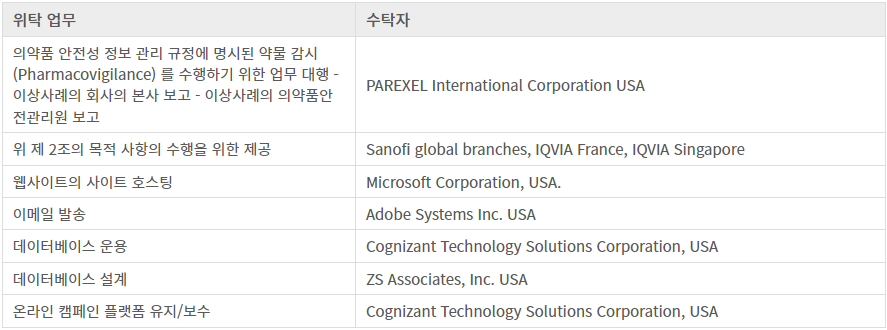 회사는 수집한 고객의 개인정보를 상기 제 2항의 목적을 위하여 필요 최소한 범위에 한하여 아래표[1-1] 및 [1-2]에 표시된 제3자에게 제공 또는 위탁할 수 있으며 위탁업무의 내용이나 수탁자가 변경될 경우에는 본 웹사이트(www.dulcolax.co.kr/ko-kr/html/main/) 내 개인정보 처리방침 페이지를 통하여 공개하도록 하겠습니다. 또한 의약품 이상사례 등 안전성 정보인 경우, 개인정보 및 민감정보를 의약품 안정성 관리를 위하여 규제당국 및 회사의 국내외 계열사에 제공 또는 위탁할 수 있습니다.